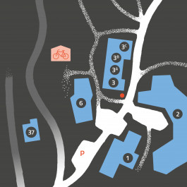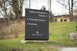 Das Leitsystem besteht aus gebogenen Stahlstelen in verschiedenen Formaten, die auf Betonfundamente montiert wurden. Eine klare Typografie und hoher Kontrast sorgen für gute Lesbarkeit und einfache Orientierung.