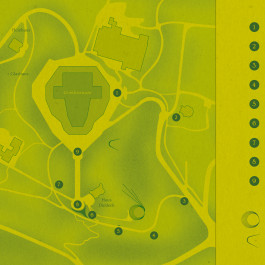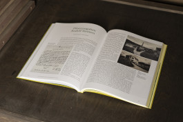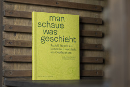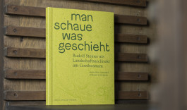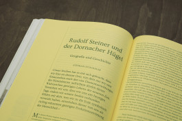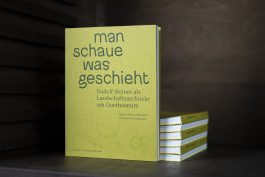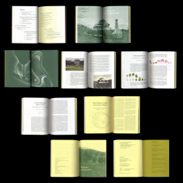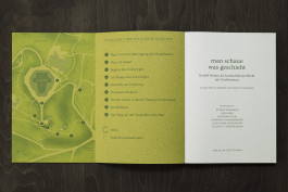 Im Fokus der Gestaltung steht das sinnliche Erleben: Das leuchtend blattgrüne Cover (Gmund Bio Cycle Chlorophyll) ist aufklappbar, die Innenseite zeigt einen Geländeplan zur Orientierung. Der Bildteil mit Erläuterungen ist auf weißem Papier gedruckt, weiterführende Texte und Quellen auf hellgelb durchgefärbtem Papier.