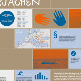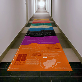Im Zentrum steht eine begehbare Skulptur aus Umzugskartons, gestaltet mit Texten, Bildern und Infografiken. Ergänzt wird sie durch Stelltafeln aus Wellpappe und einen bedruckten Bodenteppich .